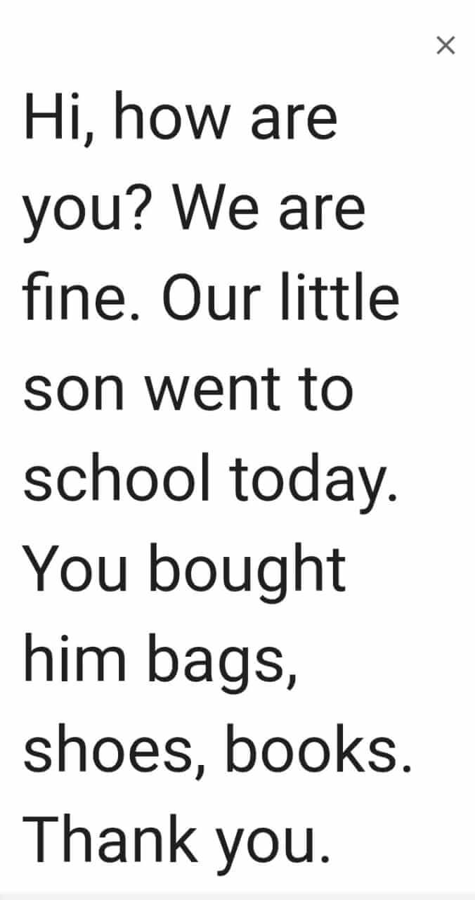 Vandaag kregen wij dit bericht van Lassar, nadat wij deze familie afgelopen zomer hadden geholpen met schoolitems voor Lasser zijn 2 zonen. Op de foto Lassar zijn jongste zoon.