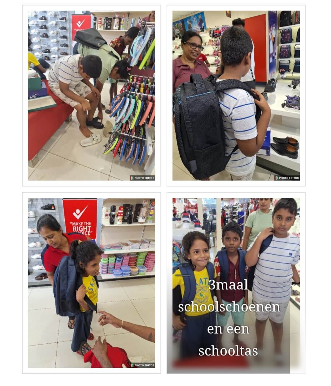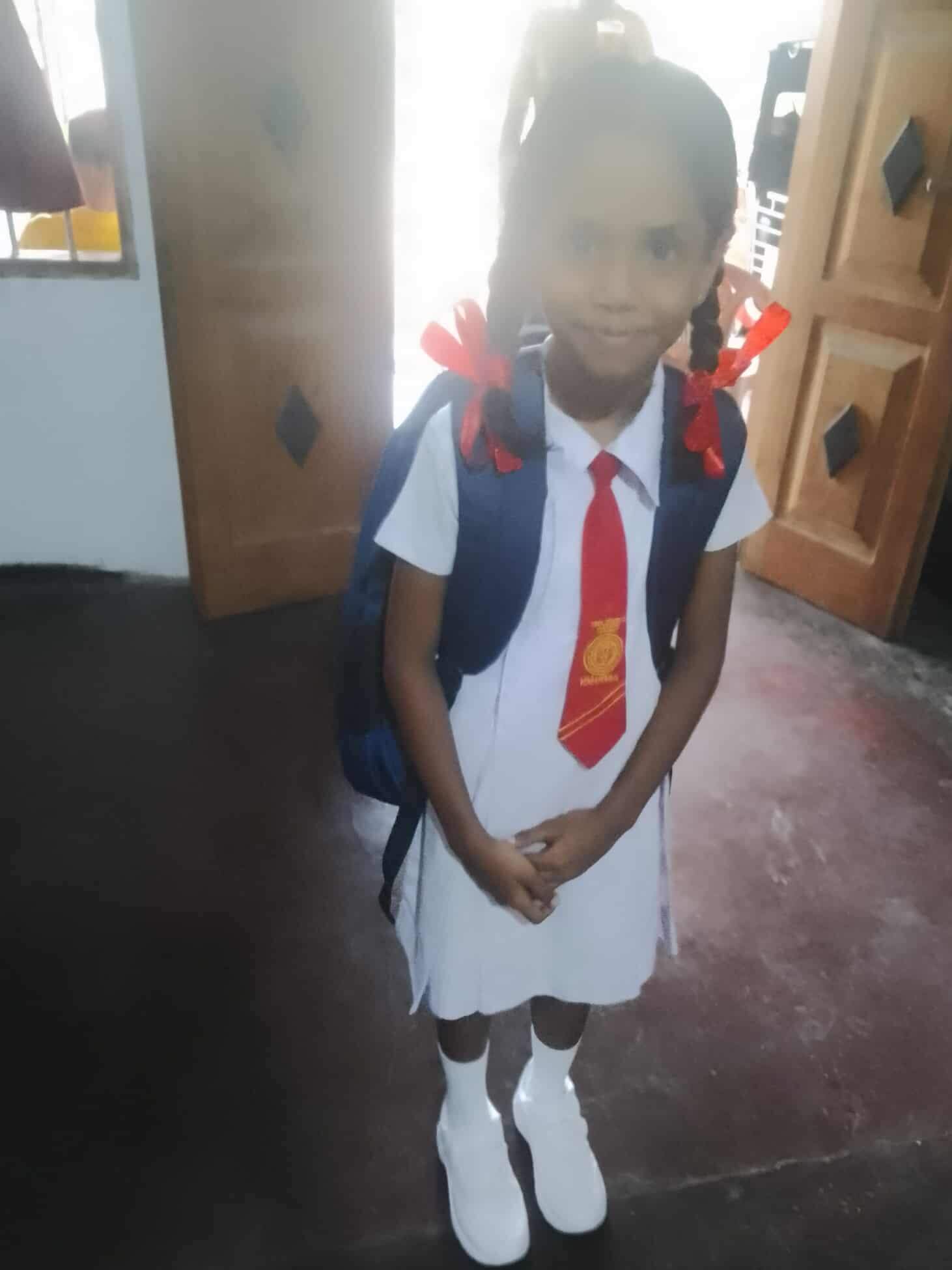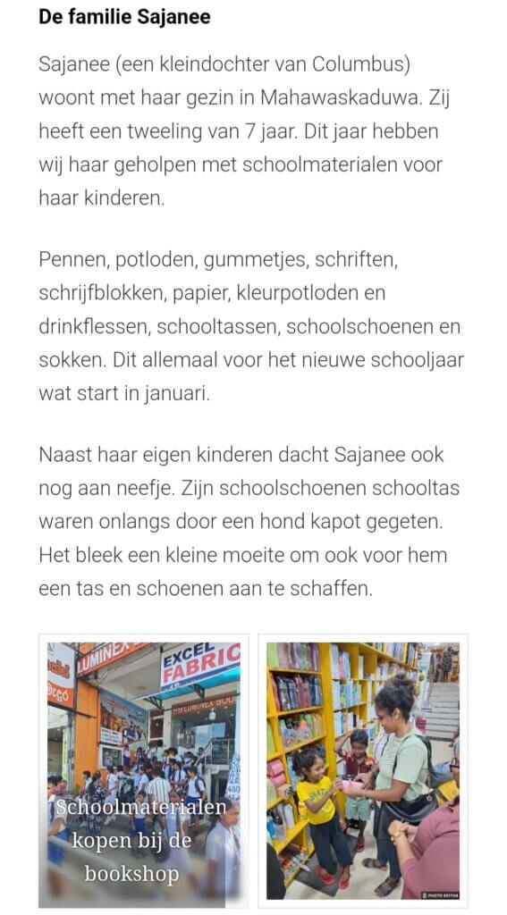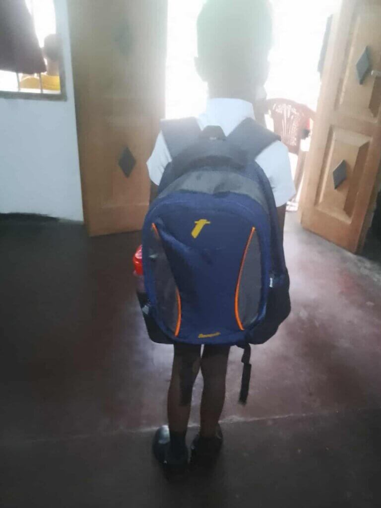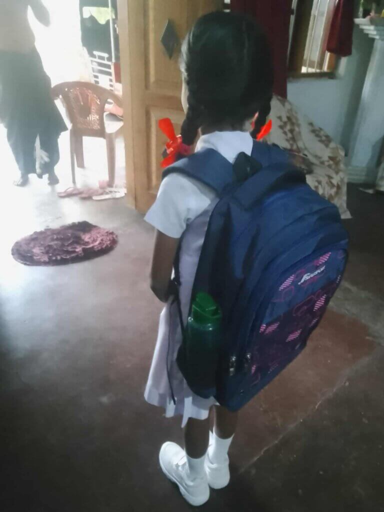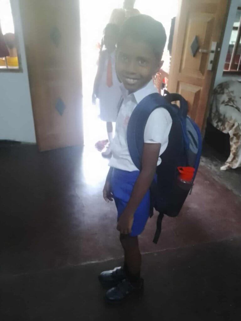 Afgelopen zomer hebben wij aan Sajanee haar kinderen schooltassen en schoolschoenen gedoneerd. Vandaag is het nieuwe Sri Lankaanse schooljaar gestart en vanochtend kregen wij foto’s van haar kinderen met de nieuwe tassen en schoolschoenen.